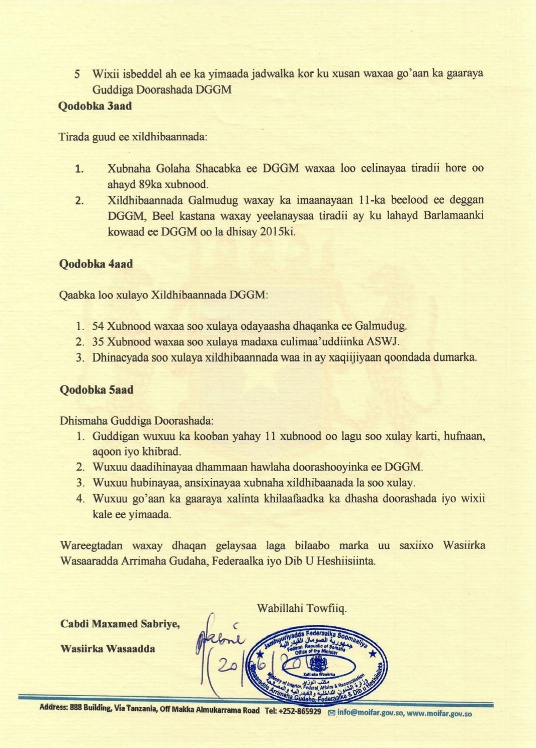 Heshiiska ayaa waxaa ku saxiixan Wasiirka Arrimaha Gudaha Federaalka iyo Dib u Heshiisiinta Dowladda Soomaaliya Cabdi Maxamed Sabriye.