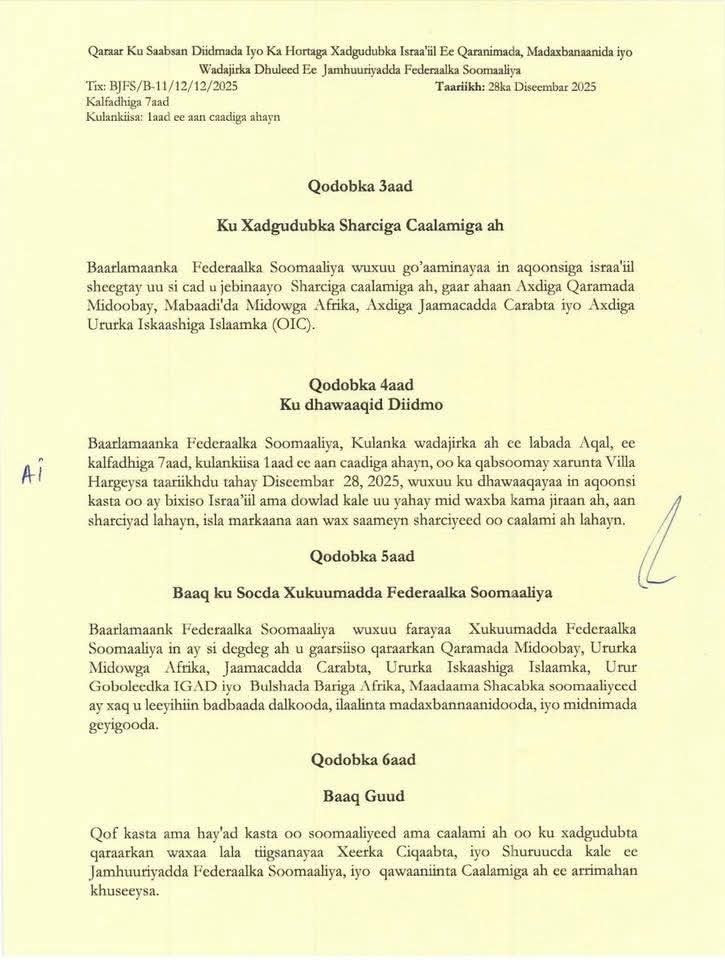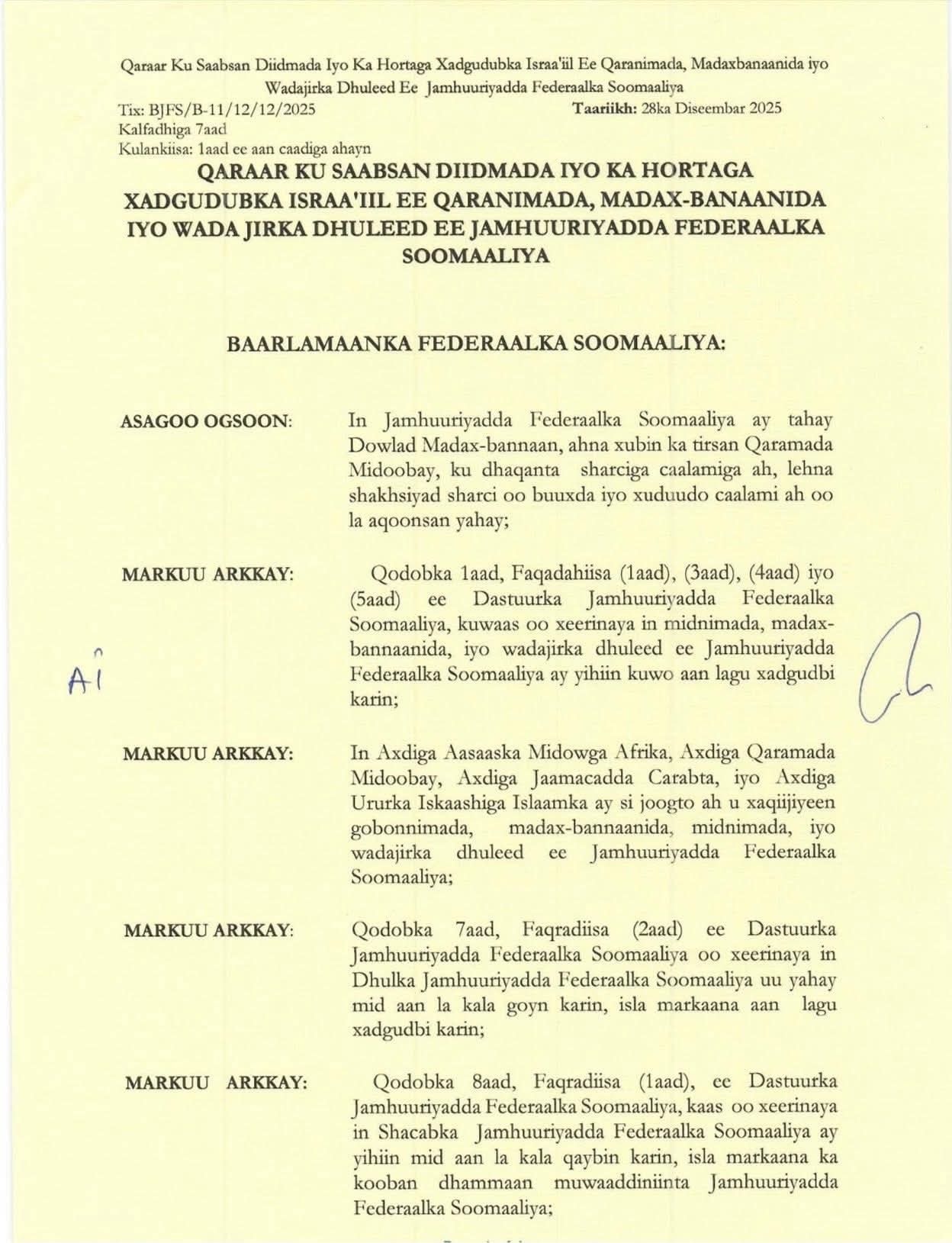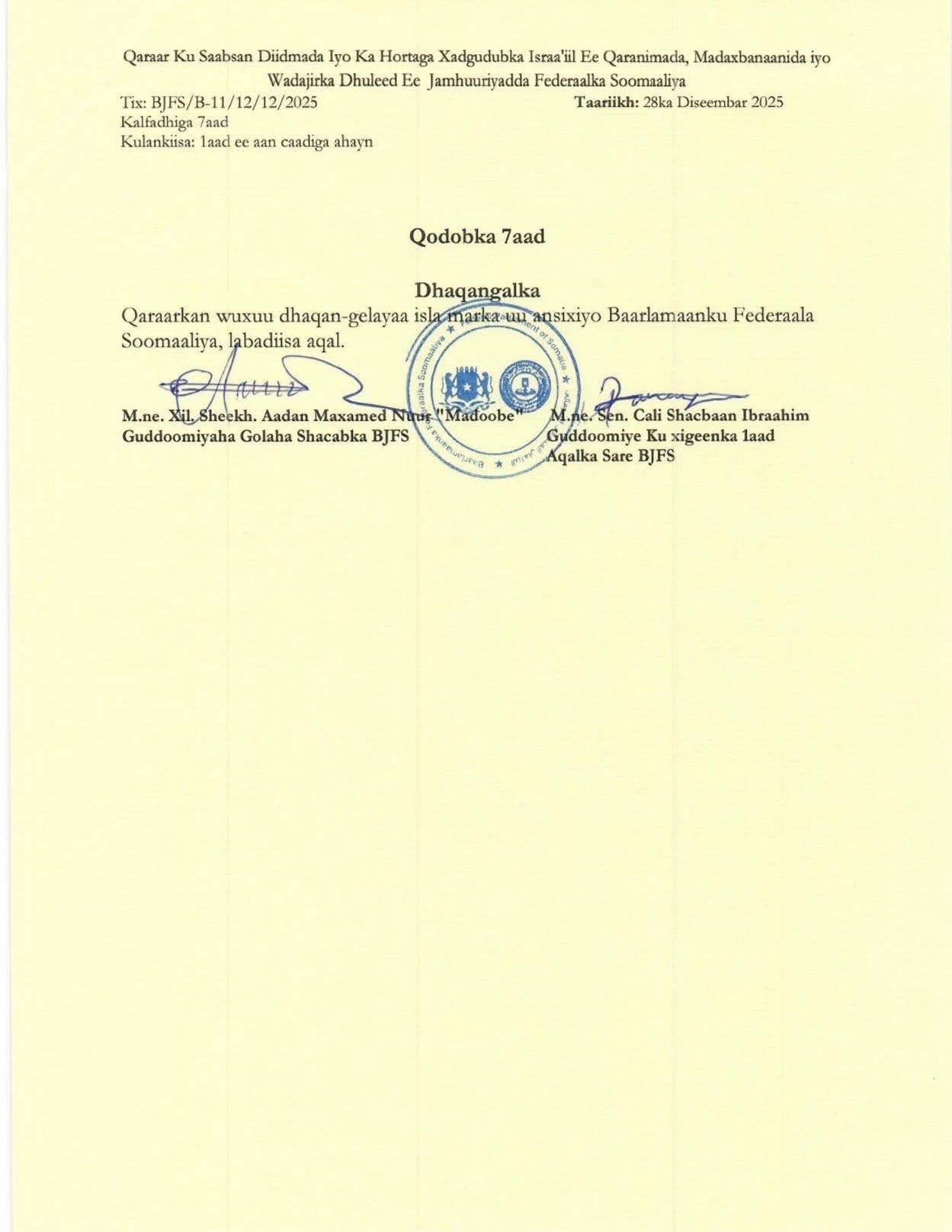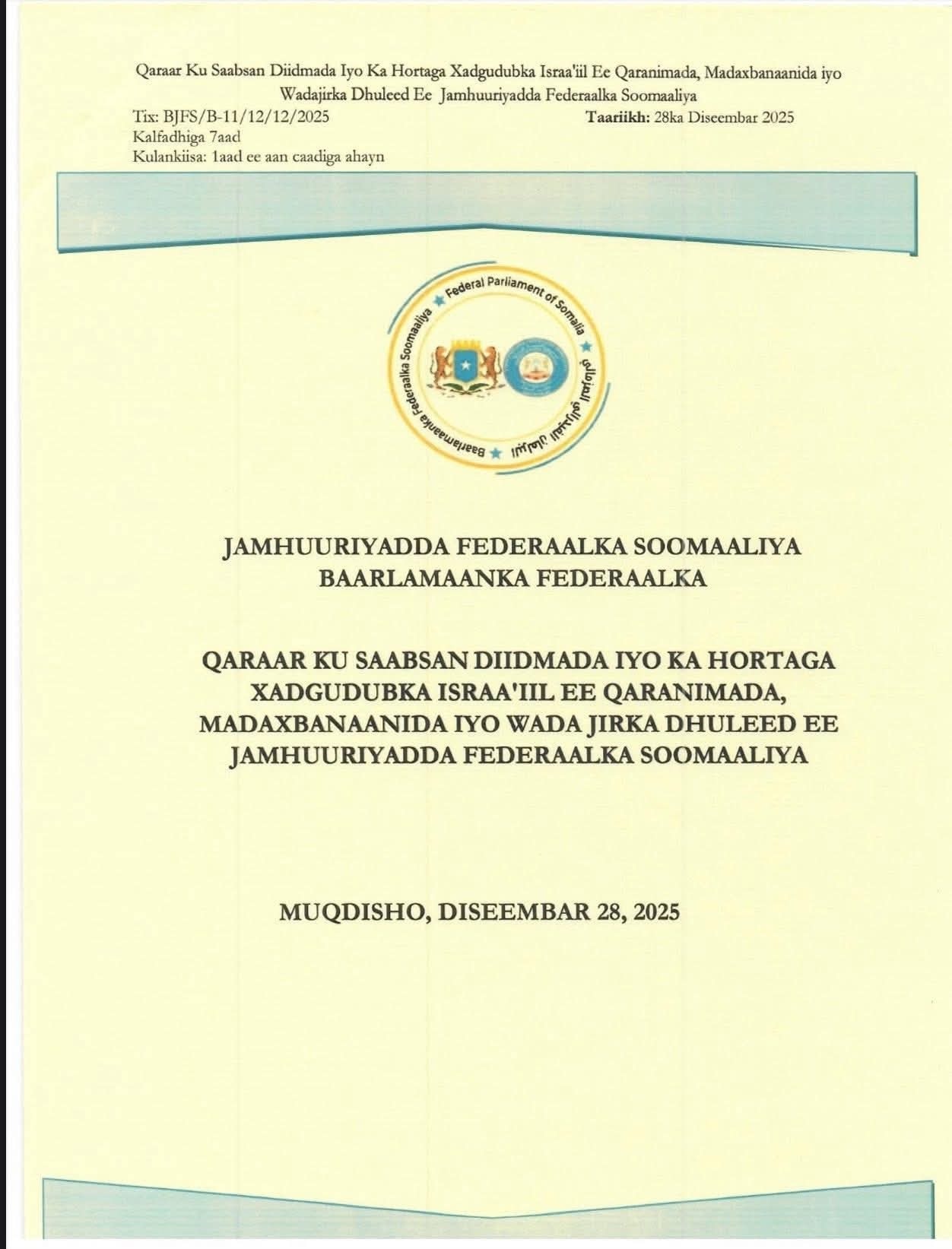 Shirkii ay maana lahaayeen labada Aqal ee Baarlamaanka Somalia ayaa ugu dambeyn goor dhaw lagu meel mariyay qaraar ku saabsan diidmada iyo ka hortaga xad-gudubka Isrll ee madaxbanaanida dhuleed iyo wada-jirka Ummadda Soomaaliyeed.