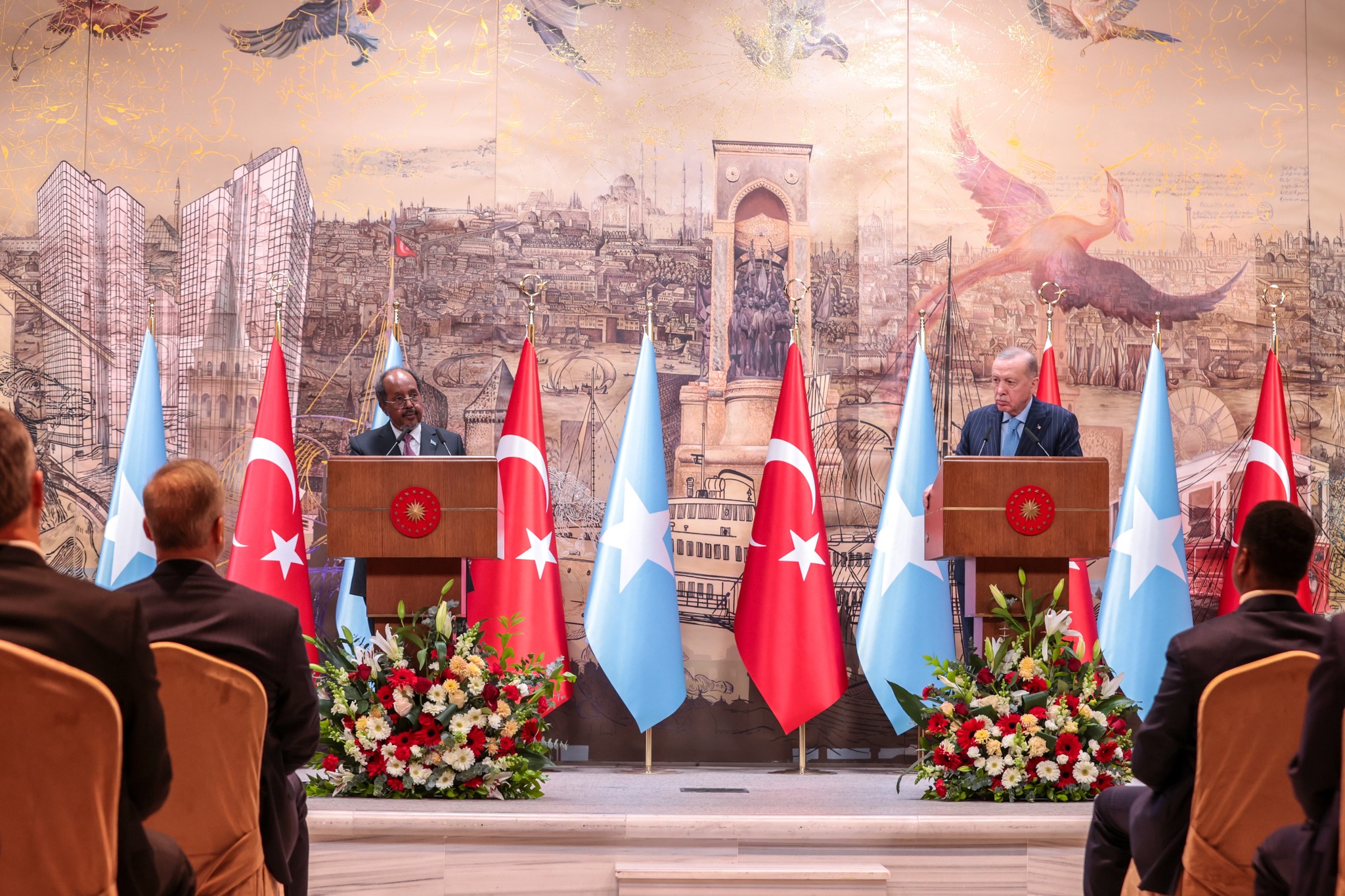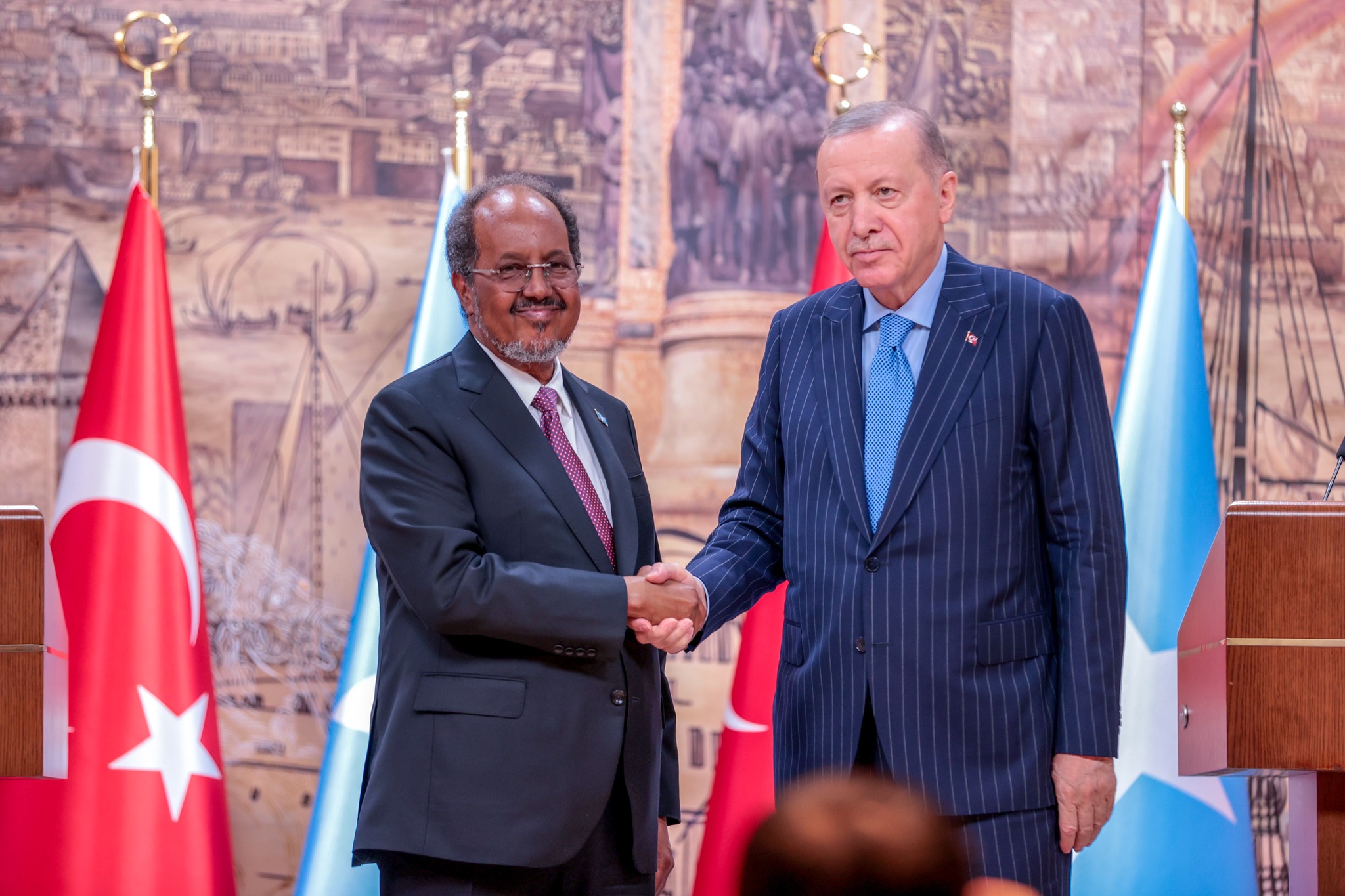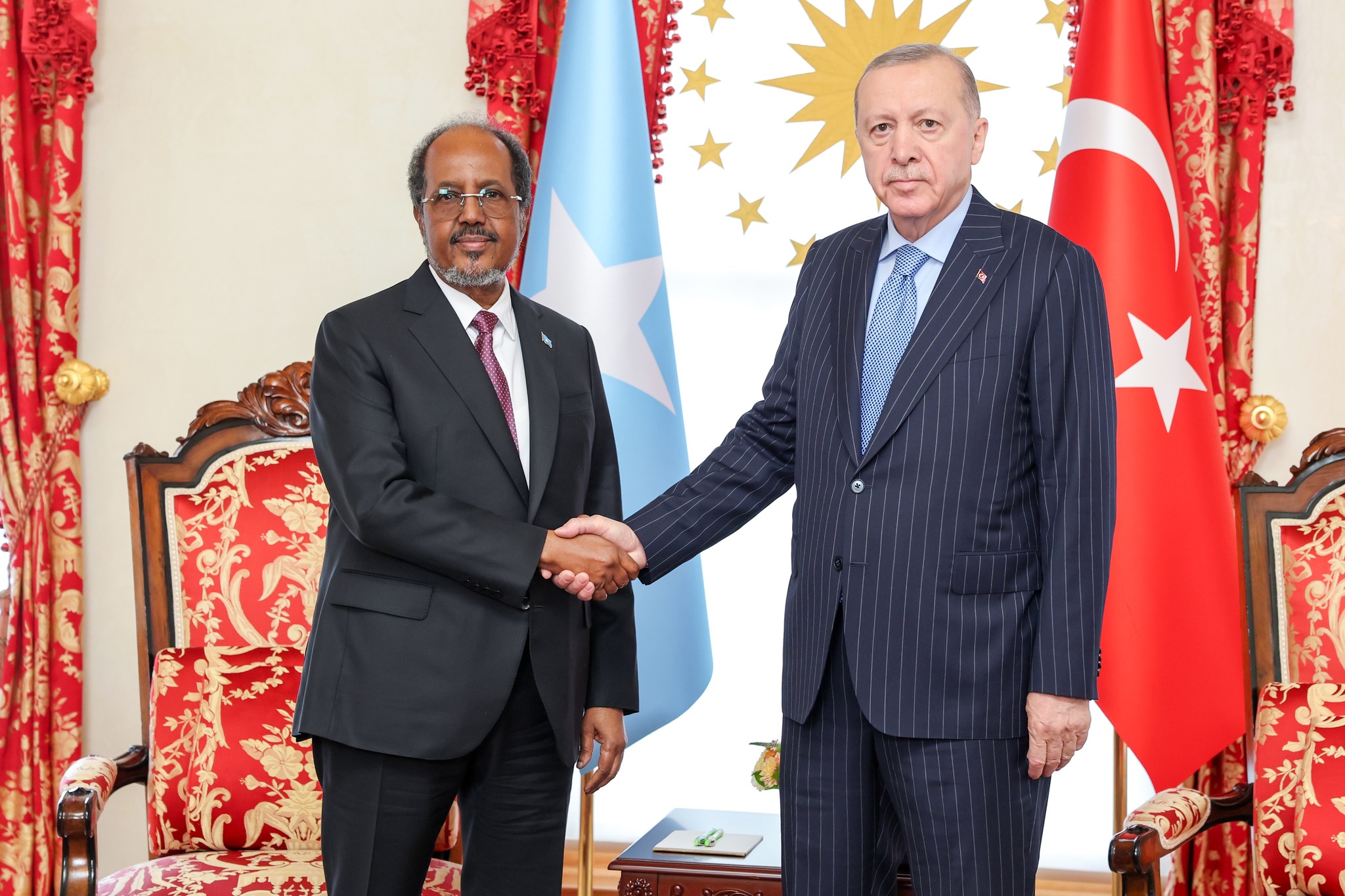Madaxweynaha Jamhuuriyadda Turkiga, Recep Tayyip Erdoğan, iyo Madaxweynaha Jamhuuriyadda Federaalka Soomaaliya, Xasan Sheekh Maxamuud, ayaa maanta kulan wadahadal ah ku yeeshay magaalada Ankara, kaddibna si wadajir ah ugu qabtay shir jaraa’id.