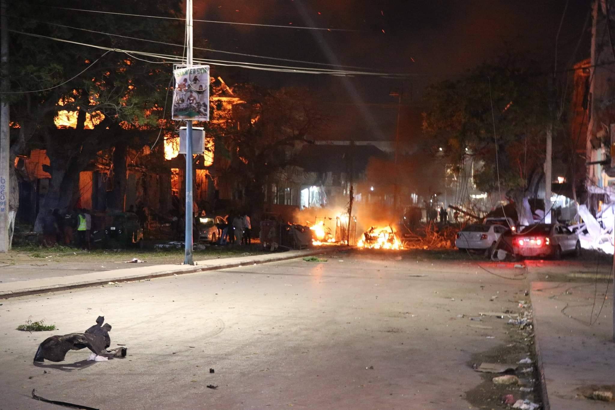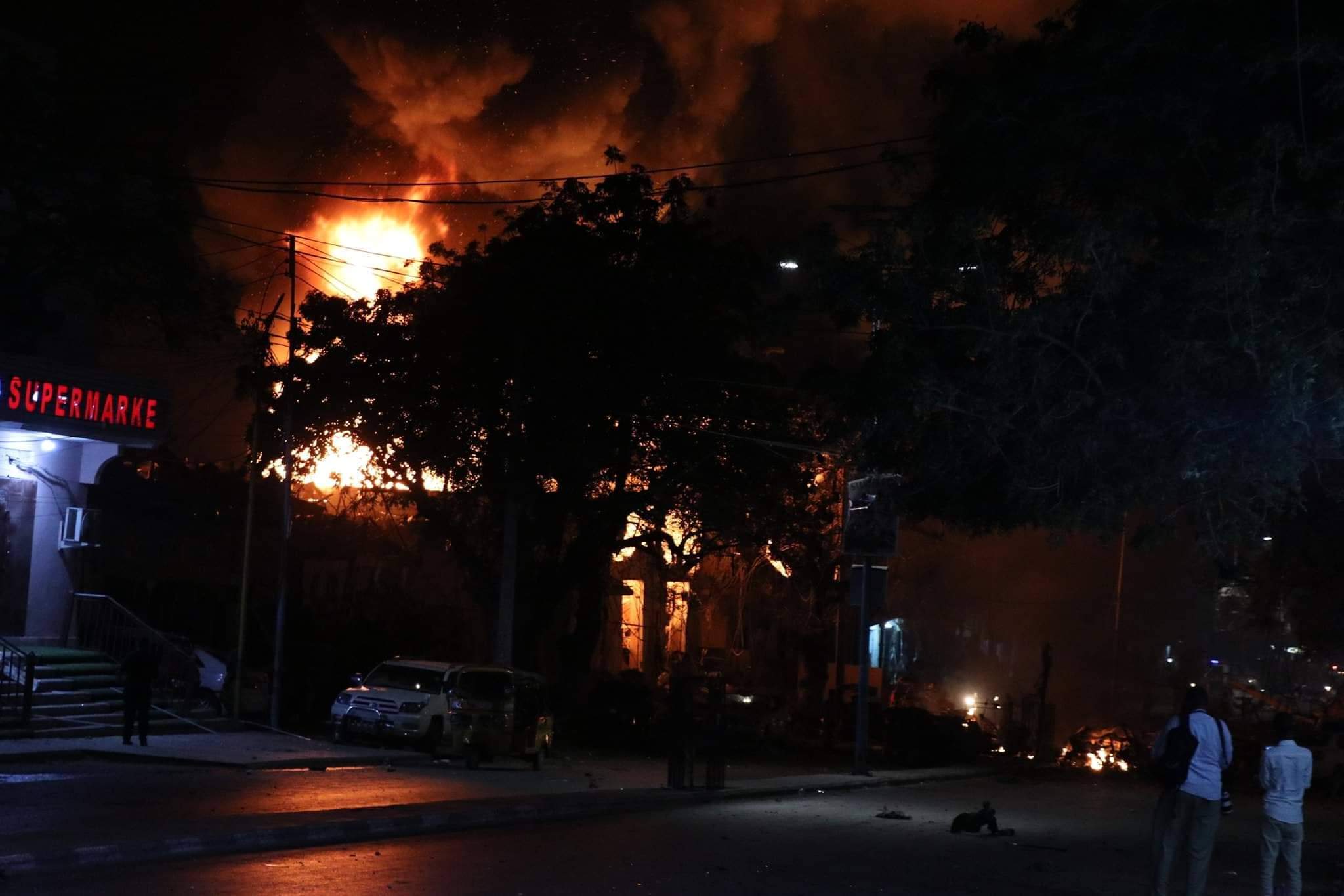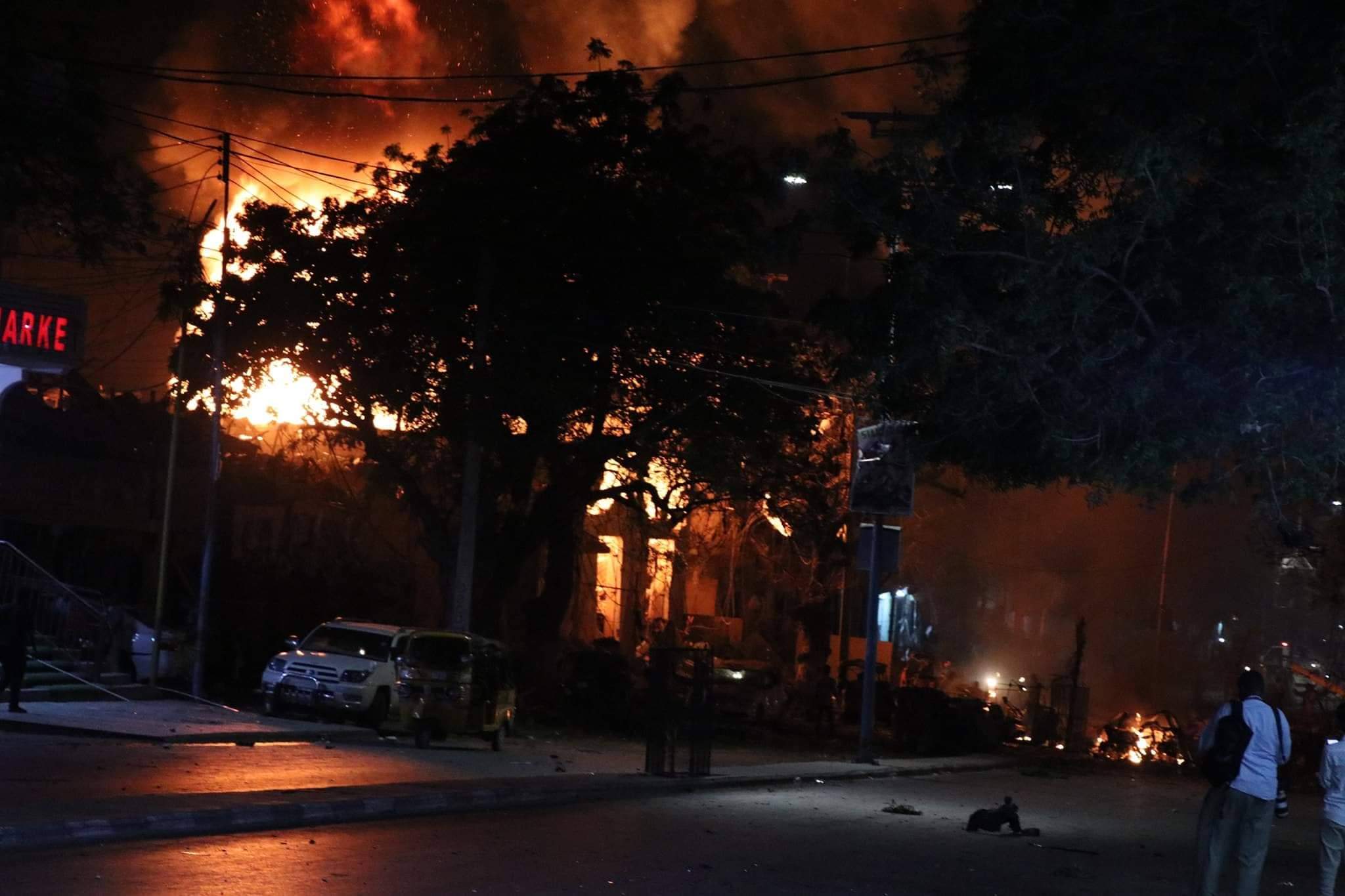 Dhismooyin goobo ganacsi ayaa gubtay & gaadiid meesha yaalay, kuwaasi oo ku gubtay dabka ka dhashay qaraxa xoogan ee caawa ka dhacay Muqdisho.