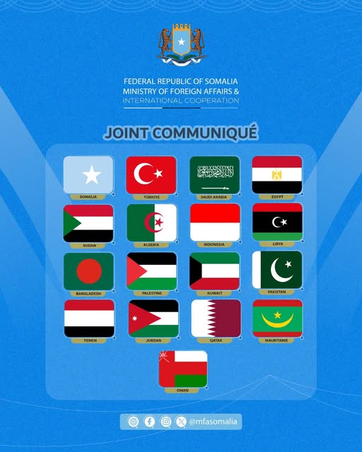 Wasiirrada Arrimaha Dibadda ee Jamhuuriyadda Federaalka Soomaaliya, Boqortooyada Sacuudi Carabiya, Dowladda Qatar, Jamhuuriyadda Carbeed ee Masar, Jamhuuriyadda Suudaan, Dowladda Liibiya, Jamhuuriyadda Dadka ee Bangladesh, Jamhuuriyadda Dimuqraadiga Dadka ee Aljeeriya, Dowladda Falastiin, Jamhuuriyadda Turkiga, Jamhuuriyadda Indonesia, Jamhuuriyadda Islaamiga ah ee Pakistan, Dowladda Kuwait, Jamhuuriyadda Islaamiga ah ee Mauritania, Boqortooyada Hashimite ee Urdun, Saldanadda Cumaan, Jamhuuriyadda Lubnaan iyo Jamhuuriyadda Yemen, waxay si adag u cambaareynayaan ku dhawaaqista Israa’11l ee magacaabista wakiil diblomaasiyadeed ee waxa loogu yeero “Somaliland”, taas oo loo arko xadgudub cad oo ka dhan ah madax-bannaanida, midnimada iyo wadajirka dhuleed ee Jamhuuriyadda Federaalka Soomaaliya.