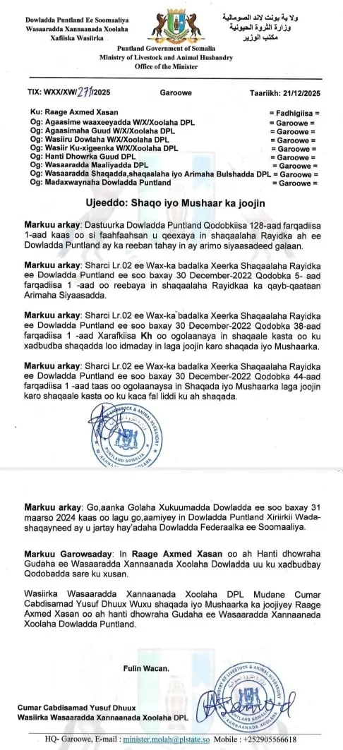 “Wasiirka Wasaaradda Xanaanada Xoolaha DPL Cumar Cabdisamad Yuusuf Dhuux wuxuu shaqada iyo mushaarka ka joojiyay Raage Axmed Xasan oo ah Hanti dhowraha gudaha ee Wasaaradd Xanaanada iyo Xoolaha Dowladda Puntland” ayaa lagu yiri qoraal uu soo saaray Wasiirku.
