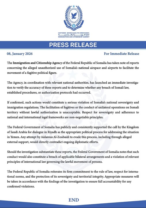 Dawladda Soomaaliya ayaa ku dhawaaqday inay bilowday baaritaan la xiriira suuragalnimada hawada iyo garoommada Soomaaliya loo adeegsaday socdaalkii uu Yemen uga soo baxsaday hoggaamiyaha golaha isbahaysiga Yemen (STC), Aidarus Al-Zubaidi , kaddib markii warsaxaafadees ka soo baxday isbahaysiga uu Sacuudiga hoggaamiye ee Yemen, lagu sheegay in la adeegsaday garoonka diyaaradaha ee Muqdisho si hoggaamiyaha STC loo geeyo Abu Dhabi.