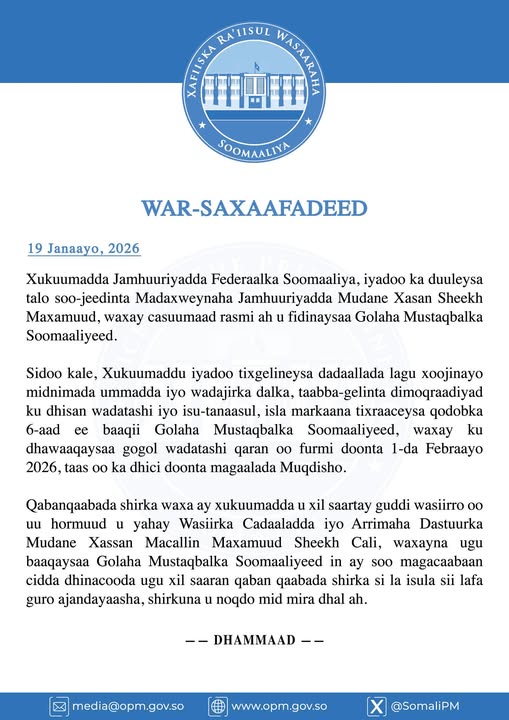 “Xukuumaddu iyadoo tixgelinaysa dadaallada lagu xoojinayo midnimada ummadda iyo wadajirka dalka, taabba-gelinta dimuqraadiyad ku dhisan wadatashi iyo isu-tanaasul, isla markaana tixraaceysa qodobka 6-aad ee baaqii Golaha Mustaqbalka Soomaaliyeed, waxay ku dhawaaqaysaa gogol wadatashi qaran oo furmi doona 1-da Febraayo 2026, taas oo ka dhici doonta magaalada Muqdisho.”