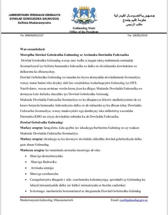 War-saxaafadeed ka soo baxay madaxtooyadda galmudug ayaa lagu hakiyay wada shaqeyntii kala dhexeeysay Dowladda Soomaaliya.