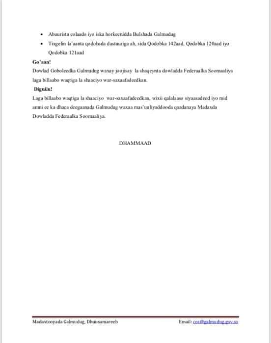 Sidoo kale Warsaxaafadeed oo aad u dheeraa ayaa galmudug waxaa ay beesha caalamka ka dalbatay inay si dhow ula socdaan xaaladda siyaasadeed ee dalka iyo in aysan aqoonsan sharciyada ay waddo xukuumadda soomaaliya iyo in ay xoojiyaan la xisaabtanka dowladda federaalka.