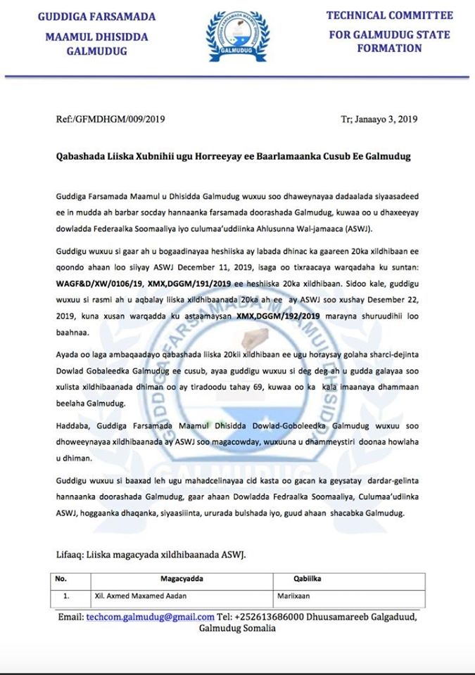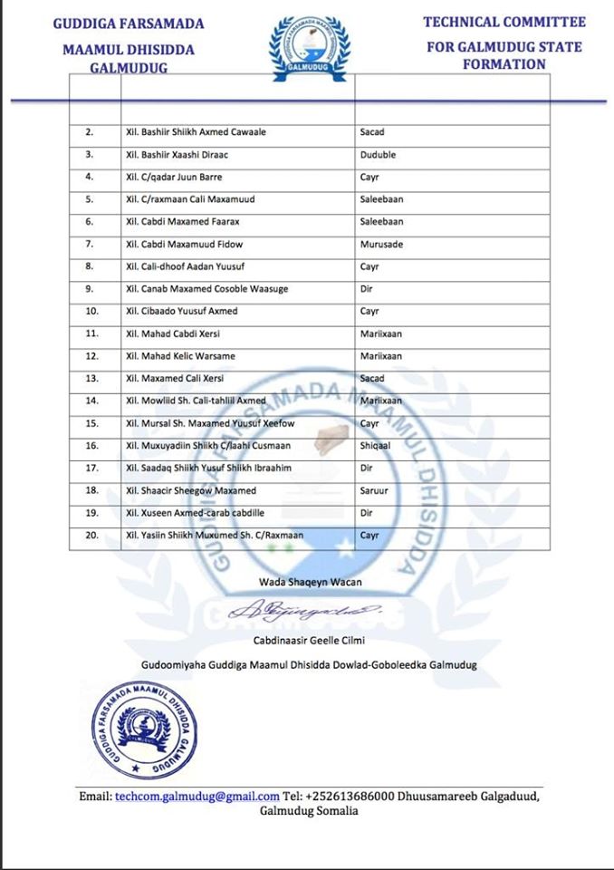 Gudiga Doorashooyinka ee Galmudug ayaa goor dhowayd si rasmi ah ugu dhowaaqay Liiska Xildhibaanada Galmudug ee Ahlu Sunna ay soo Xushay iyo Beelaha ay kasoo jeedaan.