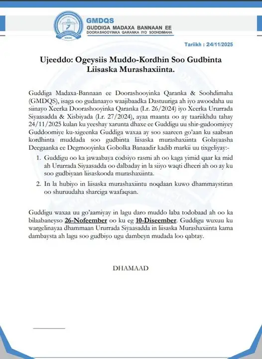 Guddigu waxaa uu go’aamiyay in lagu daro muddo laba todobaad ah oo ka bilaabaneyso 26-Nofeember oo ku eg 10-Diseember. Guddigu wuxuu ku wargelinayaa dhammaan Ururrada Siyaasadda in liisaska Murashaxiinta kama dambaysta ah lagu soo gudbiyo ugu dambeyn mudada loo gabtay.
