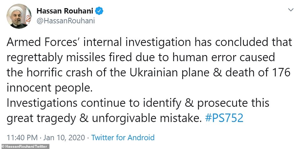 Madaxweynaha dalka Iran, Hassan Rouhani oo sidoo kale ka hadlay dhacdadaasi ayaa sheegay inay ka qoomameynayaan qaladkaan, kadib qoraal uu soo dhigay Twitter-kiisa.
