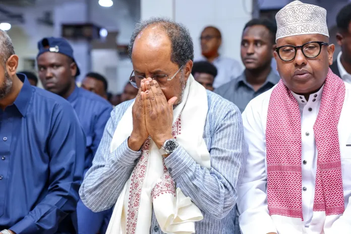 Madaxweynaha Jamhuuriyadda Federaalka Soomaaliya, Mudane Xasan Sheekh Maxamuud, oo ay wehliyaan xubno ka tirsan Golaha Wasiirrada, Taliyeyaasha Ciidanka Qalabka Sida iyo Guddoomiyaha Gobolka Banaadir, ayaa maanta boqolaal ka mid ah shacabka caasimadda Muqdisho kula tukaday Salaadda Jimcaha Masjidka Abuu Hureyra, oo ku yaalla Suuqa Bakaaraha.