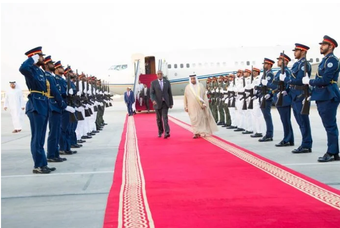 Waxaa madaxweynaha si heer sare leh ugu soo dhoweeyey garoonka Albateen airport ee magaalada Abu dhabi Wasiirka Caddaaladda ee Imaaraadka, Sultan bin Saeed Al-Badi Al Dhaheri iyo Masuuliyiin ka tirsan dawladda Imaaraadka.