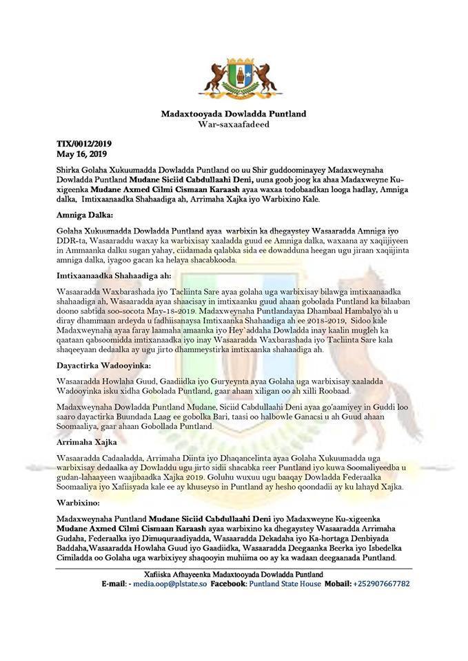 War-saxaafadeed ka soo baxay Golaha Wasiirada maamulka Puntland ayaa u qornaa sidatan:-