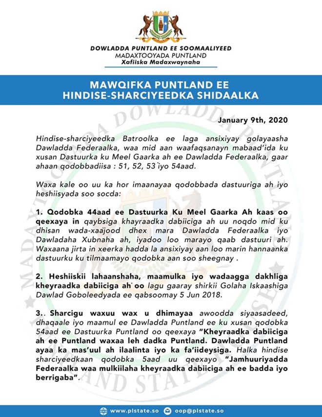 Qoraal ka soo baxay madaxtooyada Puntland, ayaa lagu sheegay in Sharciga Batroolka uusan waafaqsaneyn mabaadi’ida ku xusan Dastuurka KMG ah ee Soomaaliya, gaar ahaanna qodobkiisa 44-aad oo qeexaya in qeyb-siga Khayraadka Dabiicig ah uu noqdo mid ku dhisan Wada-xaajood dhexmara dowladda Federaalka Soomaaliya iyo dowlad goboleedyada dalka.