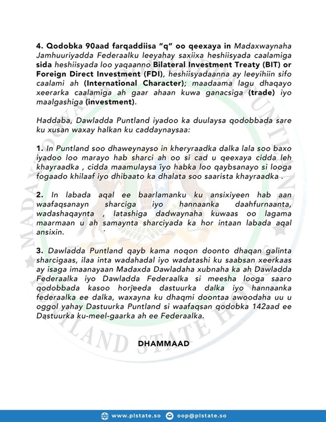 Sidoo kale, qoraalka waxa lagu caddeeyay, in Sahrcigaasi uu ka hor-imaanayo qodobka 54-aad ee Dastuurka Puntland oo dhigaya in Khayraadka Dabiiciga ah ee ku duugan dhulka Puntland, ay ilaalintiisa iyo ka faa’ideysigiisa mas’uul ka tahay dowladda Puntland.