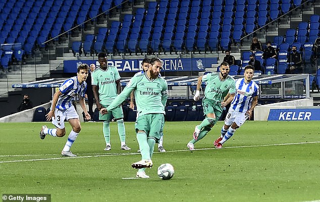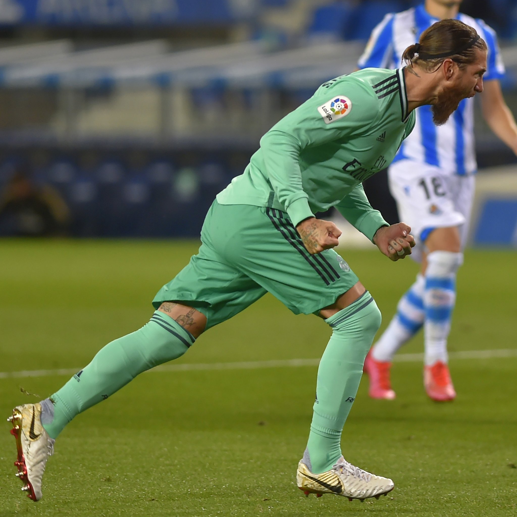 Real Madrid ayaa si rasmi ah u la wareegtay hogaanka horyaalka La Liga ka dib markii ay 2-1 ku garaaceen kooxda Real Sociedad oo marti loogu ahaa Anoeta Stadium, iyadoo kabtan Sergio Ramos iyo Karim Benzema ay shabaqa soo taabteen.