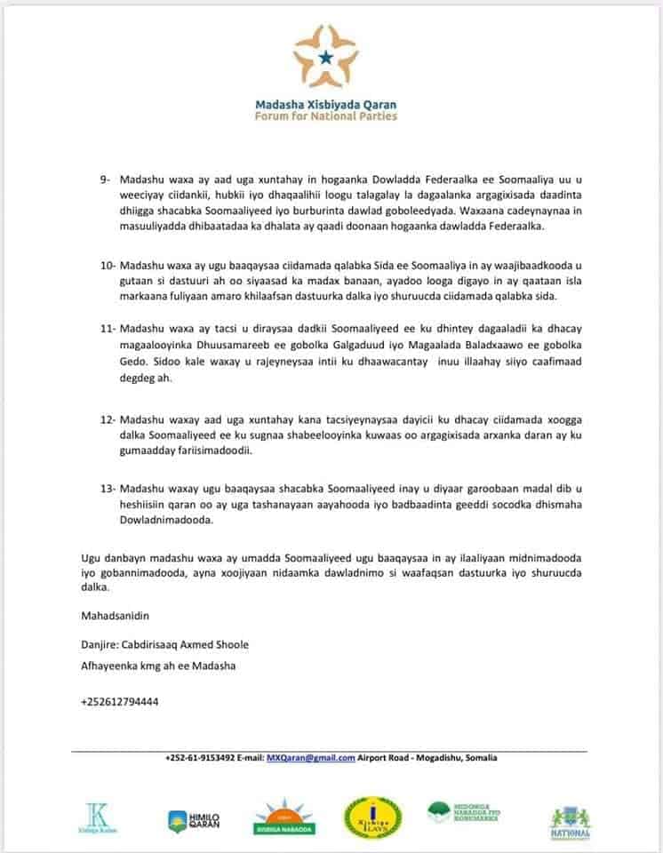 Madashada Xisbiyada ayaa sheegay inay aad uga xun yihiin in Ciidankii iyo dhaqaalihii loogu talo galay la-dagaalanka waxa loogu yeero argagaxisada loo adeegsado burburinta Dowlad Goboleedyada dalka ka jira, waxaana Shacabka Soomaaliyeed ay ugu baaqeen inay u diyaar garoobaan madal dib u heshiisiineed.