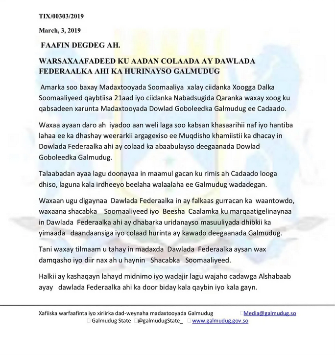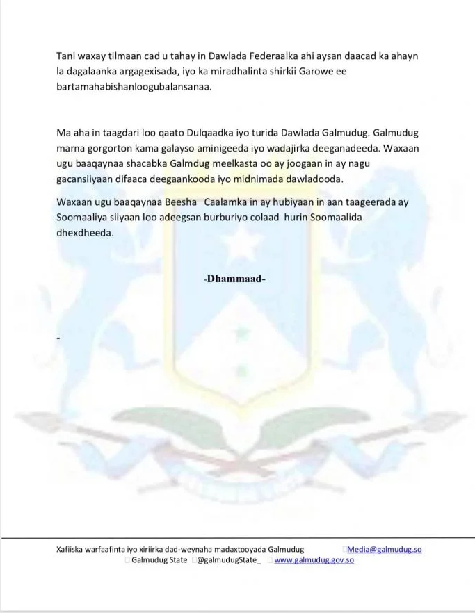 Madaxtooyada Galmudug ayaa War-Saxaafadeed kasoo saartay xiisada ka dhalatay ciidamada ka tirsan NISA ee xalay la wareegay Xarunta Madaxtooyada Galmudug ee magaalada Cadaado.