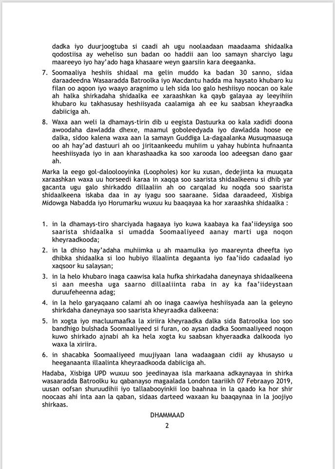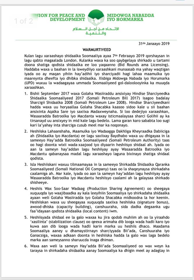 Xisbiga Midowga Nabadda iyo Horumarka ayaa caddeeyey mawqifkiisa ku aadan Shirkaas iyo guud ahaan arrimaha shidaalka Soomaaliya, kana Soo saaray war-murtiyeed.
