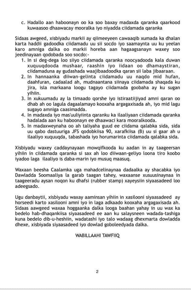 Sidoo kale Xisbiyada ayaa ka hadlay gadoodka ciidamada oo ay ku tilmaameen maamulo xumo ka jirta qaabka tirakoobka iyo xaqsiinta Ciidamada, waxaana ay intaa ku dareen inay dhacday Ciidamo hal goob jooga in qeybna la siiyay xuquuqdooda, qeybna aan la siinin.