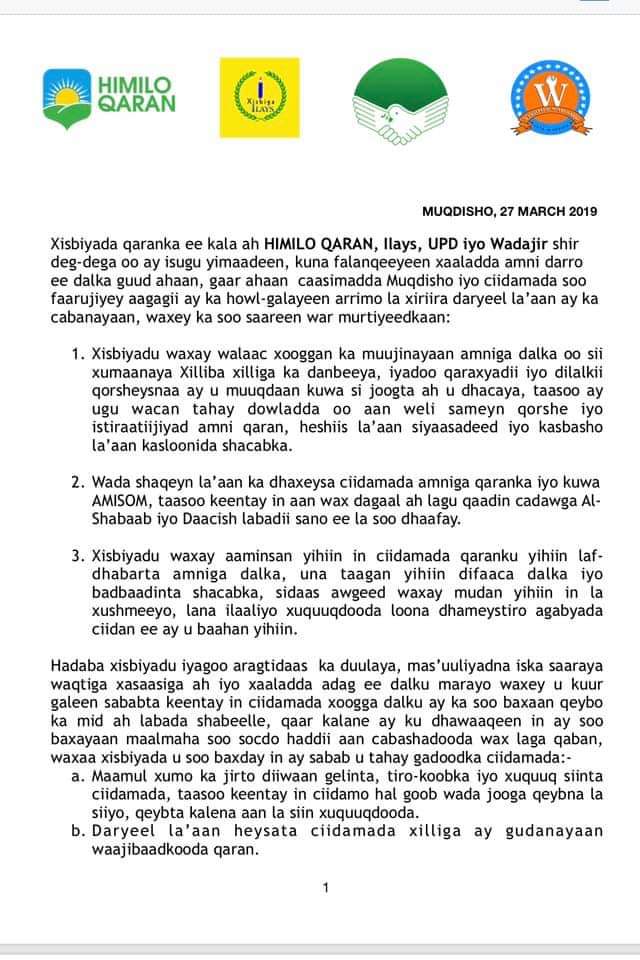 Xisbiyada siyaasadda sida UPD, Wadajir, Himilo Qaran iyo Ilays ayaa war saxaafadeed wadajir ka soo saaray xaalada amniga ee dalka, gaar ahaan magaalada Muqdisho oo maalmihii la soo dhaafay sii xumaaneysay xaaladeeda amniga.