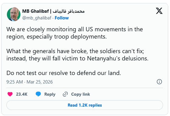 “Waxaan si dhow ula soconnaa dhammaan dhaqdhaqaaqyada Mareykanka ee gobolka, gaar ahaan ciidamada la geeyay. Waxa ay jeneraaladu jabiyeen, askartu ma hagaajin karaan; taa beddelkeeda, waxay ku dhici doonaan dhibane u ah khiyaanada Netanyahu. Ha tijaabin go’aankeenna ah inaan difaacno dhulkeenna,” Ghalibaf ayaa ku qoray X.