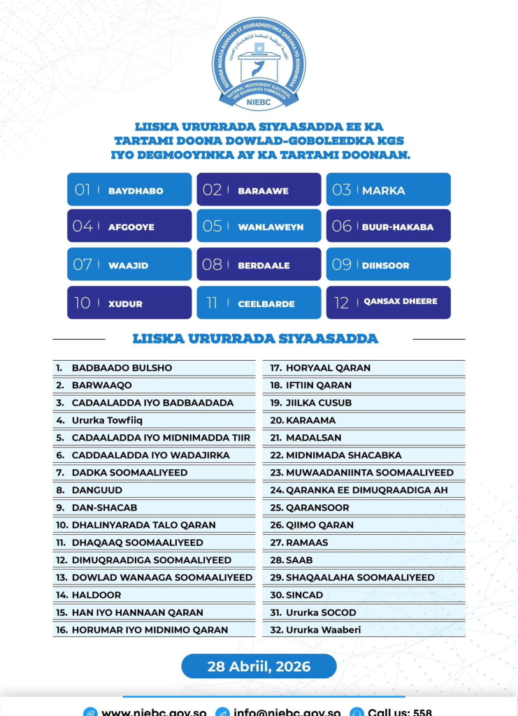 Guddiga Madaxa Bannaan ee Doorashooyinka Qaranka iyo Soohdimaha ayaa si rasmi ah ugu dhawaaqay liiska ururrada siyaasadeed ee ka qeyb geli doona doorashooyinka ka dhacaya Dowlad-goboleedka Koonfur Galbeed Soomaaliya.