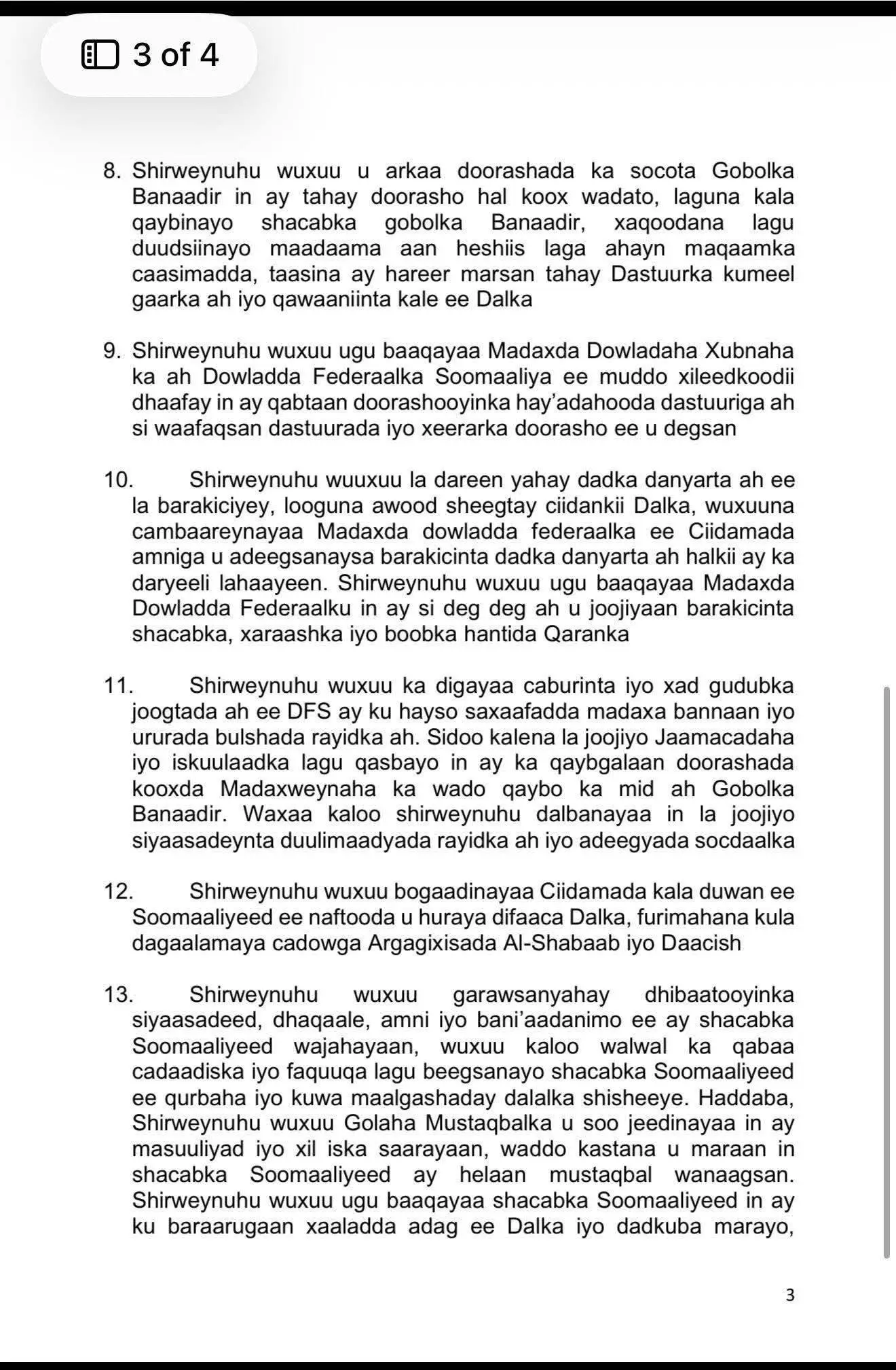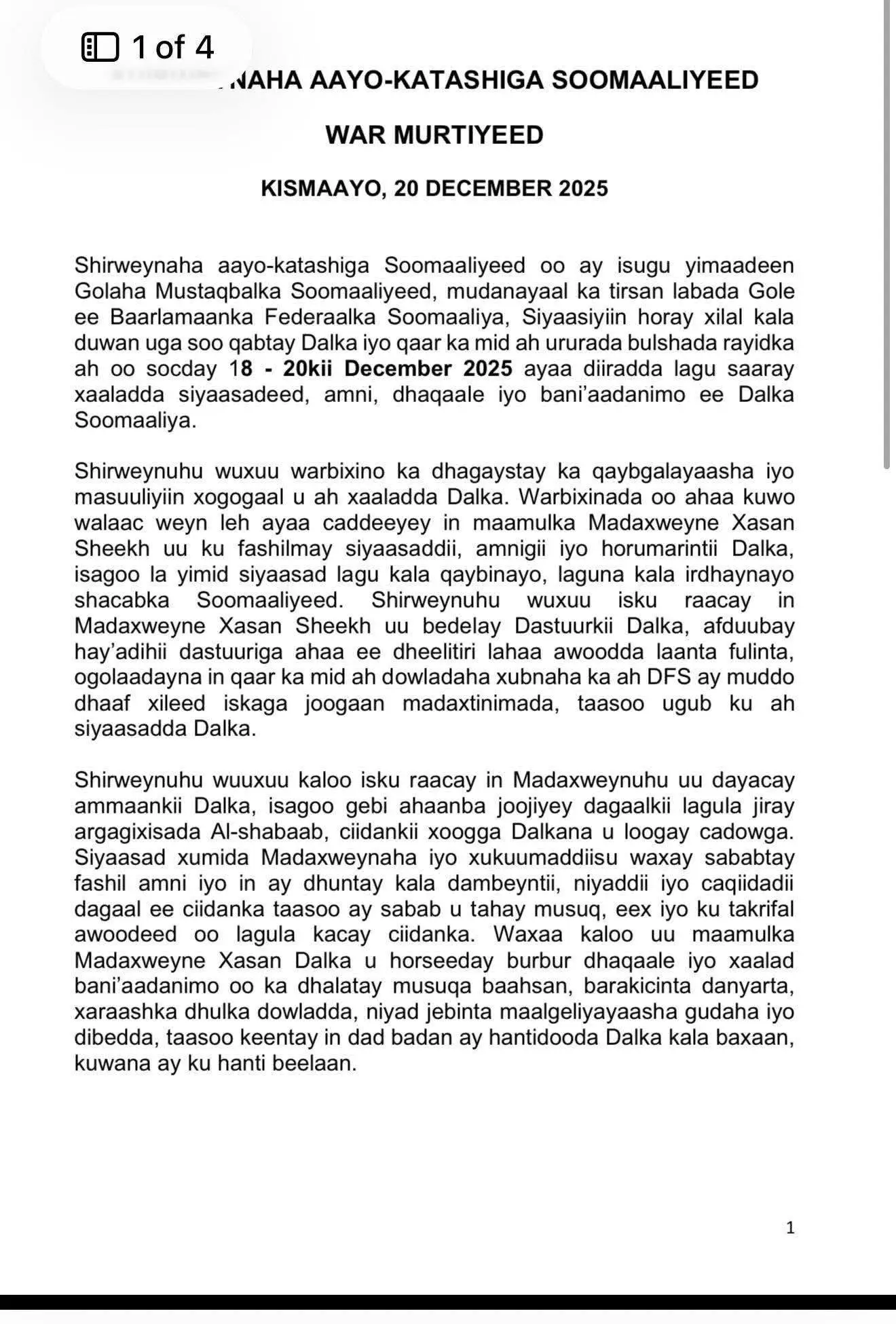 (Akhriso) War Murtiyeed ka soo baxay Shirkii Kismaayo