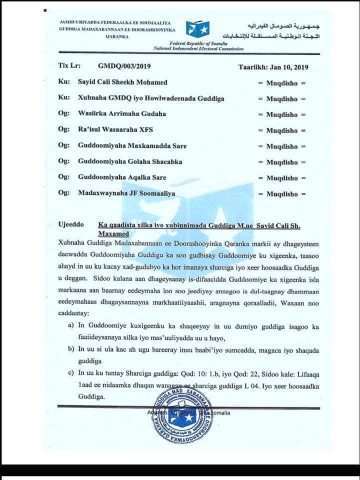 Guddoomiye Xaliimo waxa ay horay isu qabteen Sayid Cali Sh. Maxamed guddoomiye ku xigeenkii guddiga doorashooyinka qaranka kaddibna waxa ay Xaliima soosaarat warqad ay sheegtay in ay xilka uga qaadday iyada oo ku eedeysay in uu duminayey guddiga.