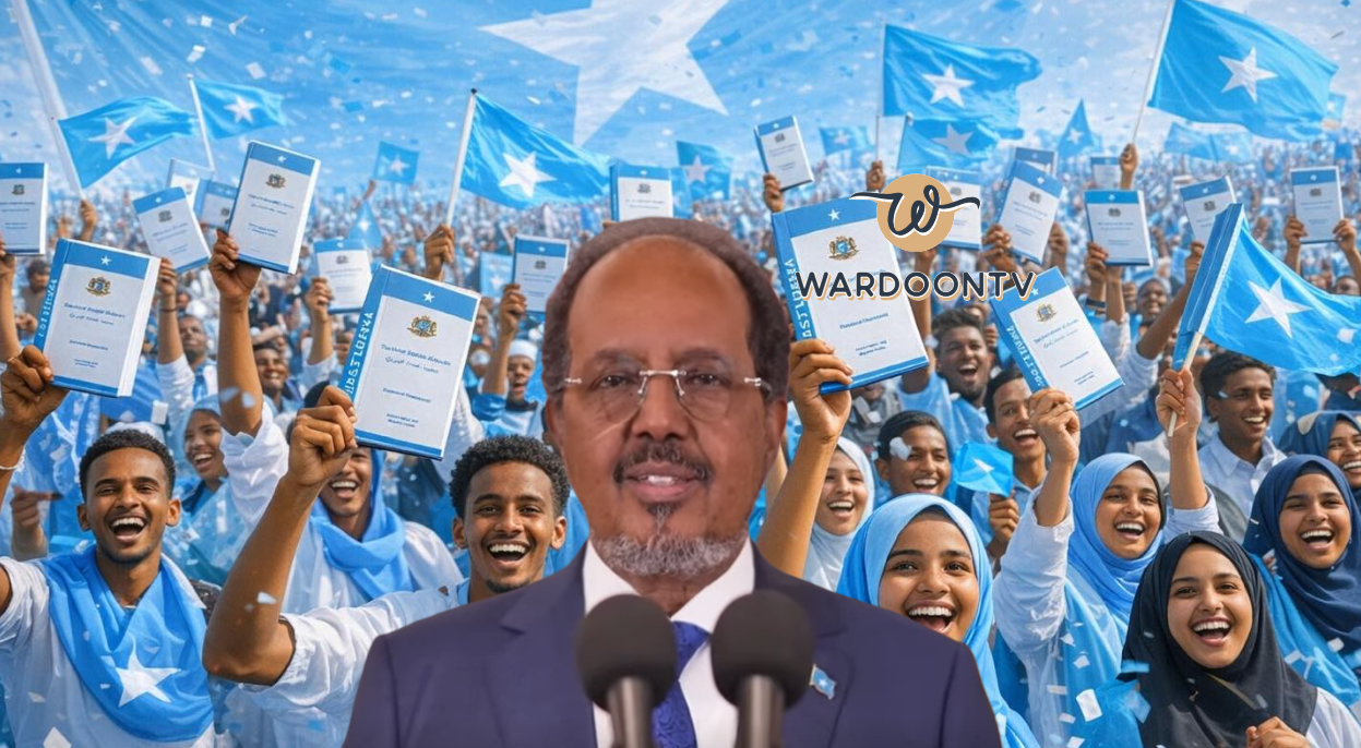Madaxweynaha Jamhuuriyadda Federaalka Soomaaliya, Dr. Xasan Sheekh Maxamuud oo caawa khudbad u jeediyay shacabka Soomaaliyeed ayaa muujiyay sida uu ugu faraxsan yahay ansixinta dhameystirka dastuurka KMG ah.