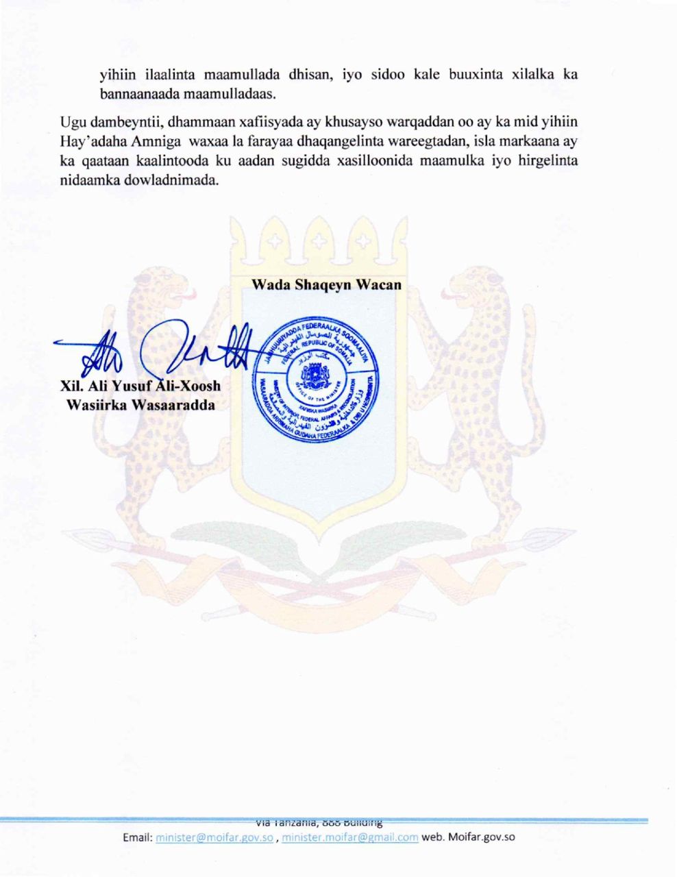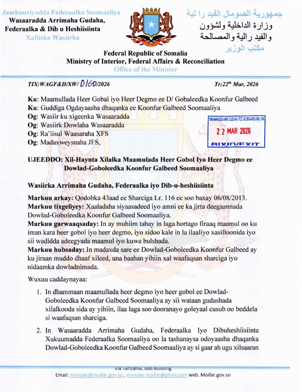 Ugu dambeyntii, dhammaan xafiisyada ay khusayso warqaddan oo ay ka mid yihiin Hay’adaha Amniga waxaa la farayaa dhaqangelinta wareegtadan, isla markaana ay ka qataan kaalintooda ku aadan sugidda xasilloonida maamulka iyo hirgelinta nidaamka dowladnimada.