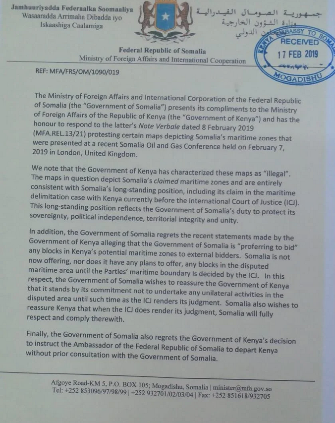Dawladda Soomaaliya waxay sheegtay in khariiradaha ay sheegtay dawladda Kenya ay muujinayso badda Soomaaliya ayna waafaqsan tahay mowqifka weligeed ee dawladda Soomaaliya iyo dawcadda ku saabsan xadka badda ee hortaalla maxkamadammada caalamiga ah ee Adudunka ee Hague. Waxay sheegtay Soomaaliya in mowqiifkaasi uu ka turjumanayo mas’uuliyadda saaran dawladda Soomaaliya ee ay ku ilaalinayso midnimada iyo madaxbannaaniddeeda siyaaso iyo dhuleed.