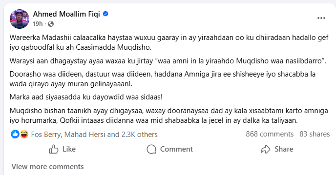 Wasiirka Gaashaandhigga Xukuumadda Federaalka Soomaaliya, Axmed Macallin Fiqi ayaa sidoo kale sheegay in magaalada Muqdisho bishan taariikh dhigi doonta, iyada oo dooraneysa, “dad ay kala xisaabtami karto amniga iyo horumarka, qofkii intaas diidanna waa mid shabaabka la jecel in ay dalka ka taliyaan,” ayuu ku yiri qaraalkiisa.