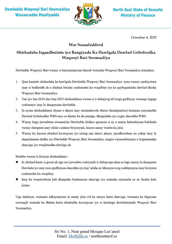 Wasaaradda Maaliyadda Waqooyi Bari Soomaaliya ayaa war-saxaafadeed ay soo saartay ku sheegtay in qaar kamid ah shirkadaha isgaarsiinta iyo bangiyada ka hawlgala degaanka ay si cad u diideen bixinta cashuuraha ku waajibay iyo inay la shaqeeyaan dawlad dhiska WBS.