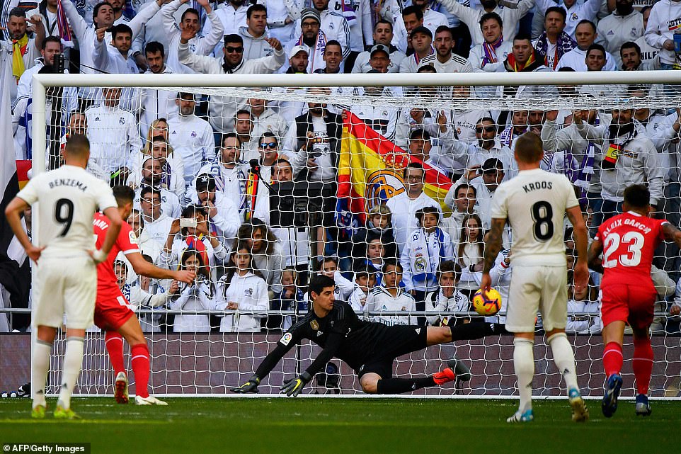 HALIS: Girona ayaa u muuqatay mid xilli horeba heshay goolka bar-bardhaca, Mid kamid ah xiddigaha Girona ayaa kubadda kasoo tuuray geeska waxaana darbad madax ah goolka Madrid ku beegay Anthony Lozano, Isku daygaas ayuu badbaadiyay Courtois waxaana ay kubadda helay Stuani oo si fudud goolka oo furan ku dhalin karayay balse halka sarre mariyay.