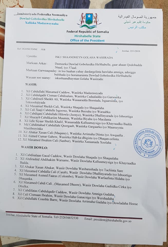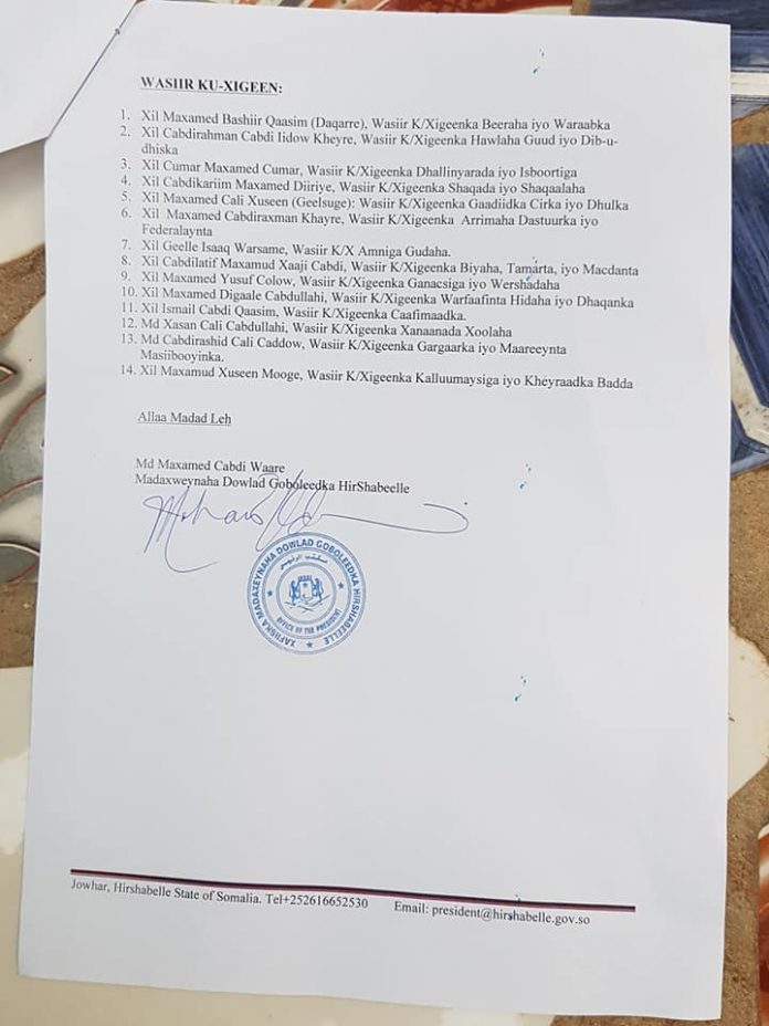 Madaxweynaha Maamulka Hirshabeelle Maxamed Cabdi Waare ayaa waxa uu isku shaandheyn uu ku sameeyay golahiisa Wasiirada, waxaane uuu sidooo kale magacaabay wasiiro cusub.