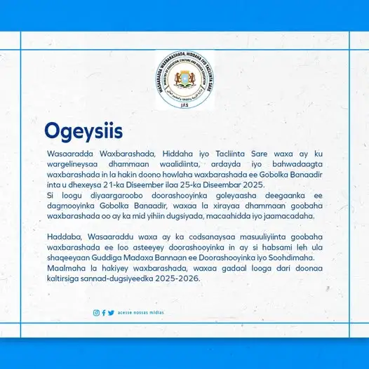 “WasaaraddaWaxbarashada, Hiddaha iyo Tacliinta Sare waxa ay ku wargelineysaa dhammaan waalidiinta, ardayda iyo bahwadaagta waxbarashada in la hakin doono howlaha waxbarashada ee Gobolka Banaadir inta u dhexeysa 21-ka Diseember ilaa 25-ka Diseembar 2025, Si loogu diyaargaroobo doorashooyinka goleyaasha deegaanka ee dagmooyinka Gobolka Banaadir, waxaa la xirayaa dhammaan goobaha waxbarashada oo ay ka mid yihiin dugsiyada, macaahidda iyo jaamacadaha” ayaa lagu yiri warka kasoo baxay Wasaaradda Waxbarashada XFS.