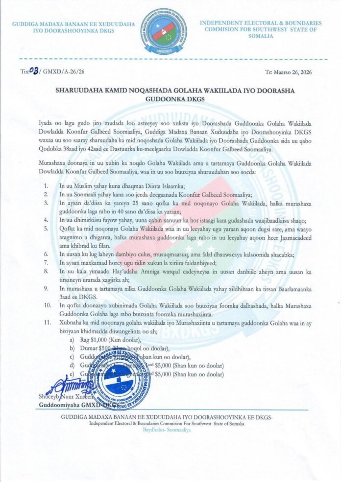 Gudiga Doorashooyinka iyo Xuduudaha Maamulka Koofur-Galbeed ayaa soo bandhigay shuruudaha laga rabo musharixiinta dadka doonaya inay noqdaan Xubin Golaha Wakiilada Maamulkaasi.