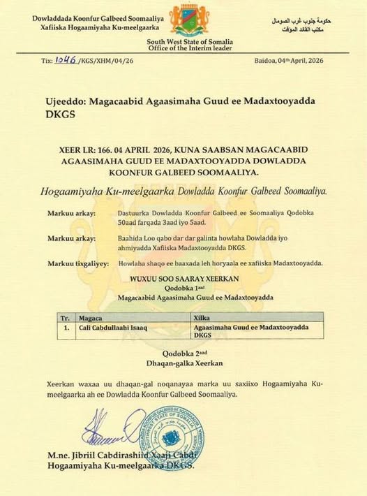 Hogaamiye Jabriil Cabdirashiid Xaaji Cali wuxuu Agaasimaha Guud ee Madaxtooyada Dowlad Goboleedka Koonfur Galbeed u magacaabay Cabdulaahi Isaaq.