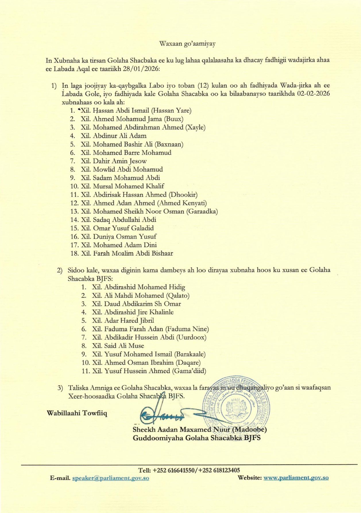 Guddoomiyaha Golaha Shacabka Sheekh Aadan Maxamed Nuur (Madoobe) oo qoraal soo saaray ayaa 12 kulan oo xiriir ah ka joojiyay18 Xildhibaan oo ka tirsan Golaha, kuwaas oo qayb ka ahaa qalalaasihii ka dhacay fadhigii wadajirka ahaa ee labada Aqal ee qabsoomay 28-kii Janaayo, 2026-ka.