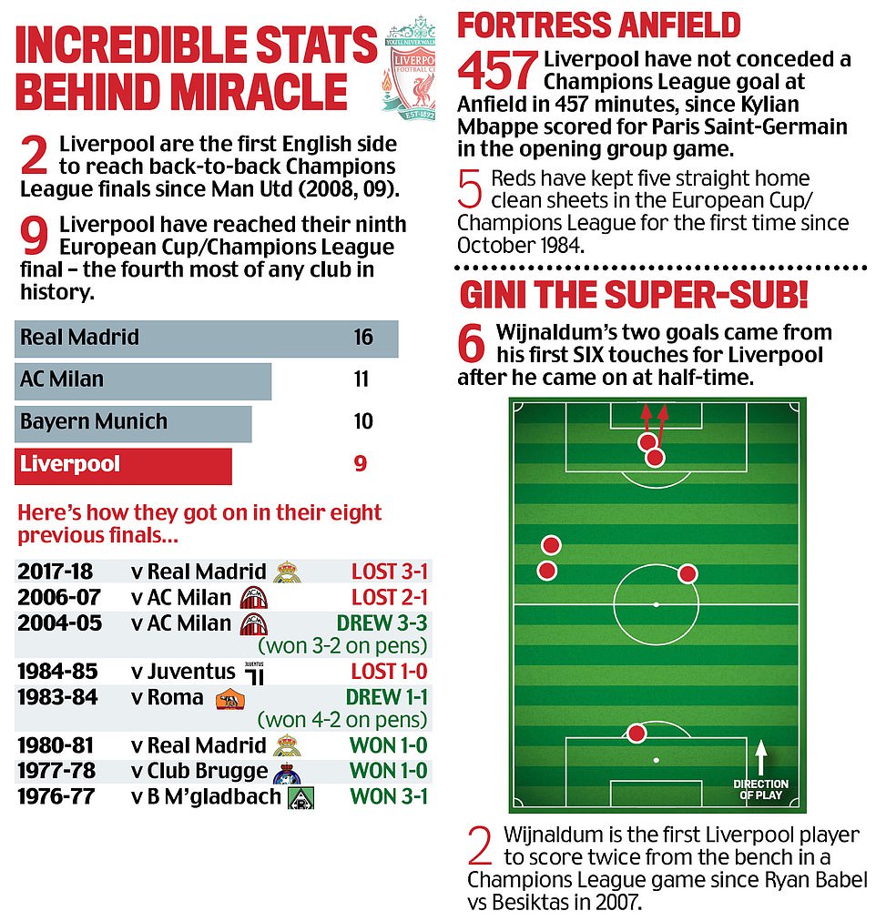 Origi iyo Gini Wijnaldum ayaa min laba gool dhaliyay waxayna dhinaca kale u dhigeen natiijadii 3-0 ka ahayd ee ay Barcelona ku xusaabtamaysay ee kulankii lugtii hore waxayna hadda kooxda Jurgen Klopp samaysay mid ka mid ah mucjisooyinkii Champions league ugu layaabka badnaa.