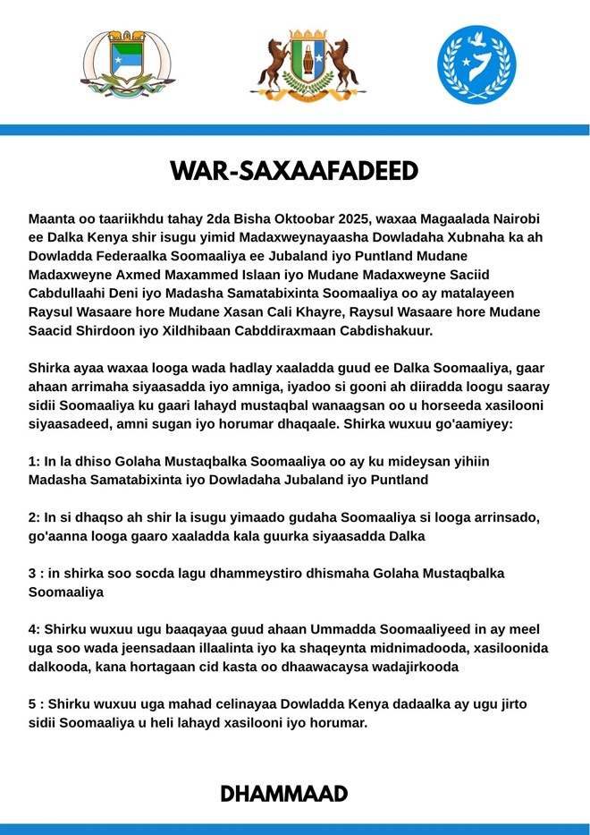 Shir ay magaalada Nairobi ku yeesheen madaxweynayaasha Jubbaland, Puntland iyo Madasha Samatabixinta Soomaaliya, ayaa lagu gaaray in si dhaqso ah shir loogu yeero dhammaan qaybaha siyaasadda Soomaaliya si xal qaran looga gaaro caqabadaha jira.