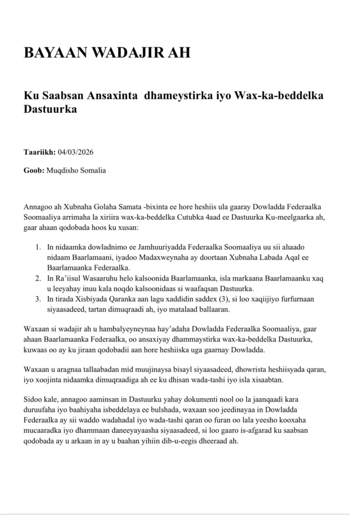 Xubnaha Golaha Samata-bixinta ee horey heshiiska ula gaaray Dowladda Federaalka Soomaaliya oo bayaan wadajir ah soo saaray ayaa caddeeyay mowqifkooda ku aadan ansixinta wax ka beddelka dastuurka oo ay shalay cod aqlabiyad leh ku meel mariyeen Labada Aqal ee Baarlamaanka Soomaaliya.
