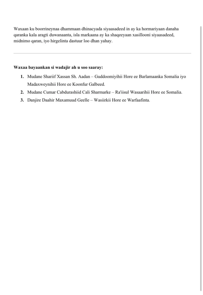 Sidoo kale waxa ay bayaankooda ku sheegeen in tallaabadan ay muujineyso biseyl siyaasadeed, iyaga oo ugu baaqay siyaasiyiinta kale ee mucaaradka in ay fiiriyaan danta guud iyo horumarka dalka.