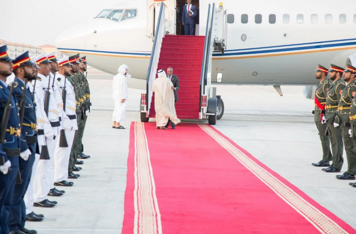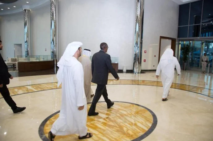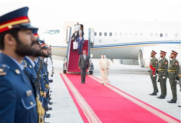 Waxaa madaxweynaha si heer sare leh ugu soo dhoweeyey garoonka Albateen airport ee magaalada Abu dhabi Wasiirka Caddaaladda ee Imaaraadka, Sultan bin Saeed Al-Badi Al Dhaheri iyo Masuuliyiin ka tirsan dawladda Imaaraadka.