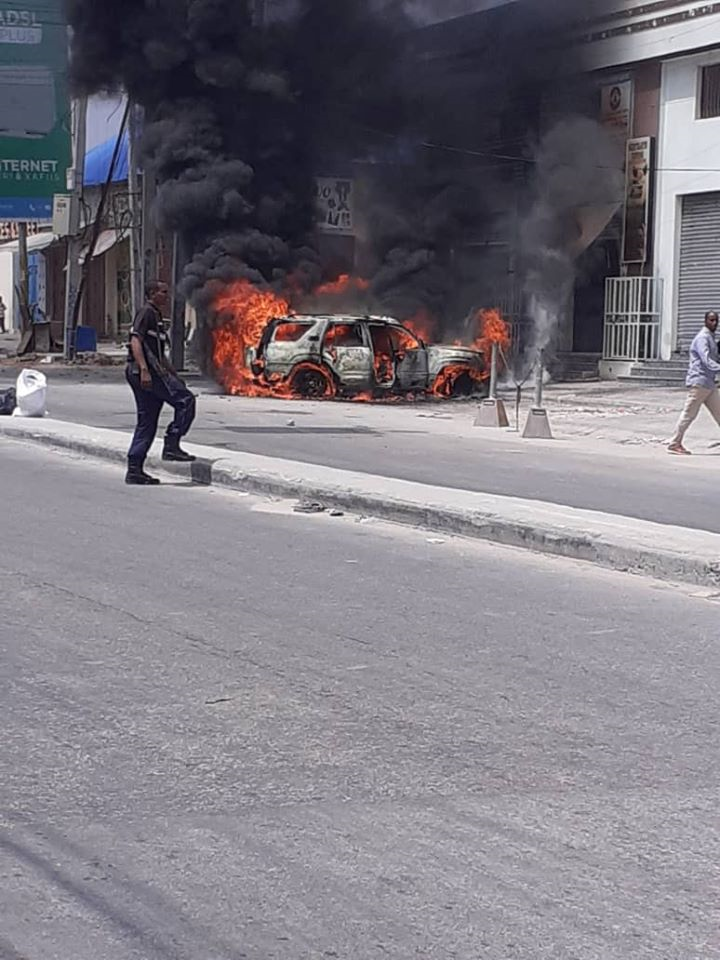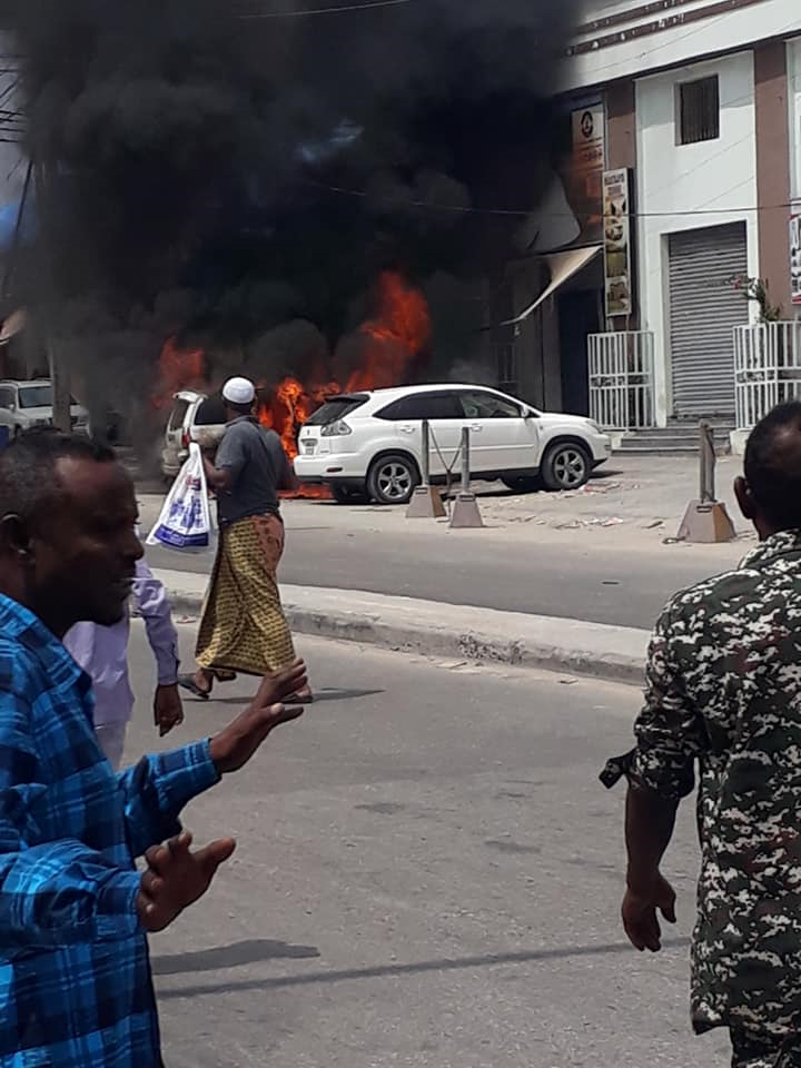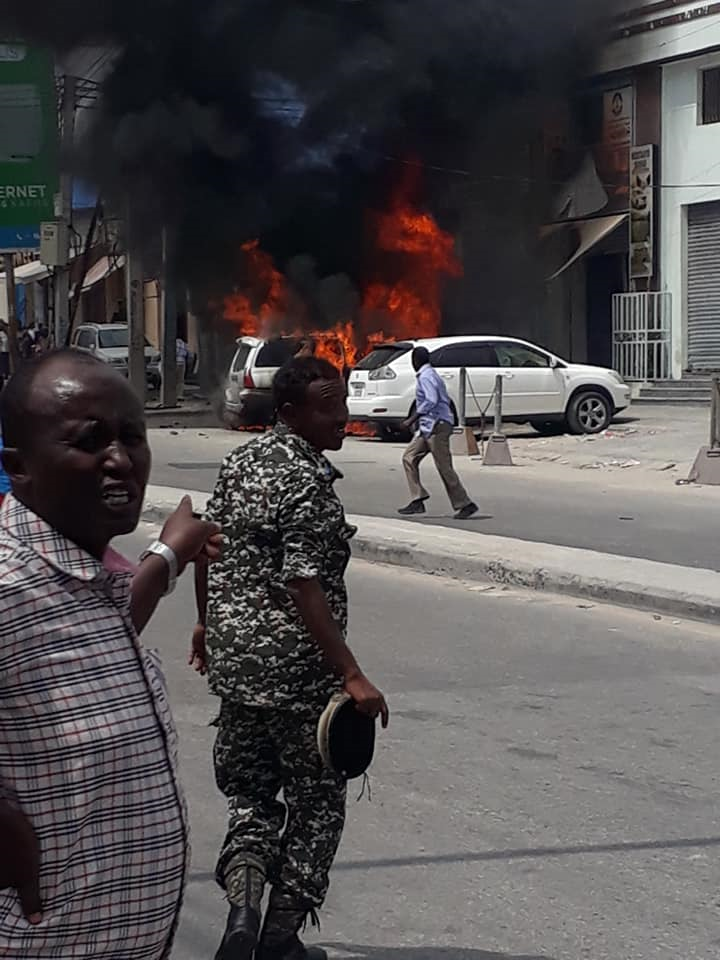 Goob joogayaal ayaa sheegaya in gaariga qaraxa lagu soo xiray uu dab xoog leh qabsaday qaraxa ka dib, waxaana goobta gaaray ciidamada amaanka iyo gaadiidka dab demiska.