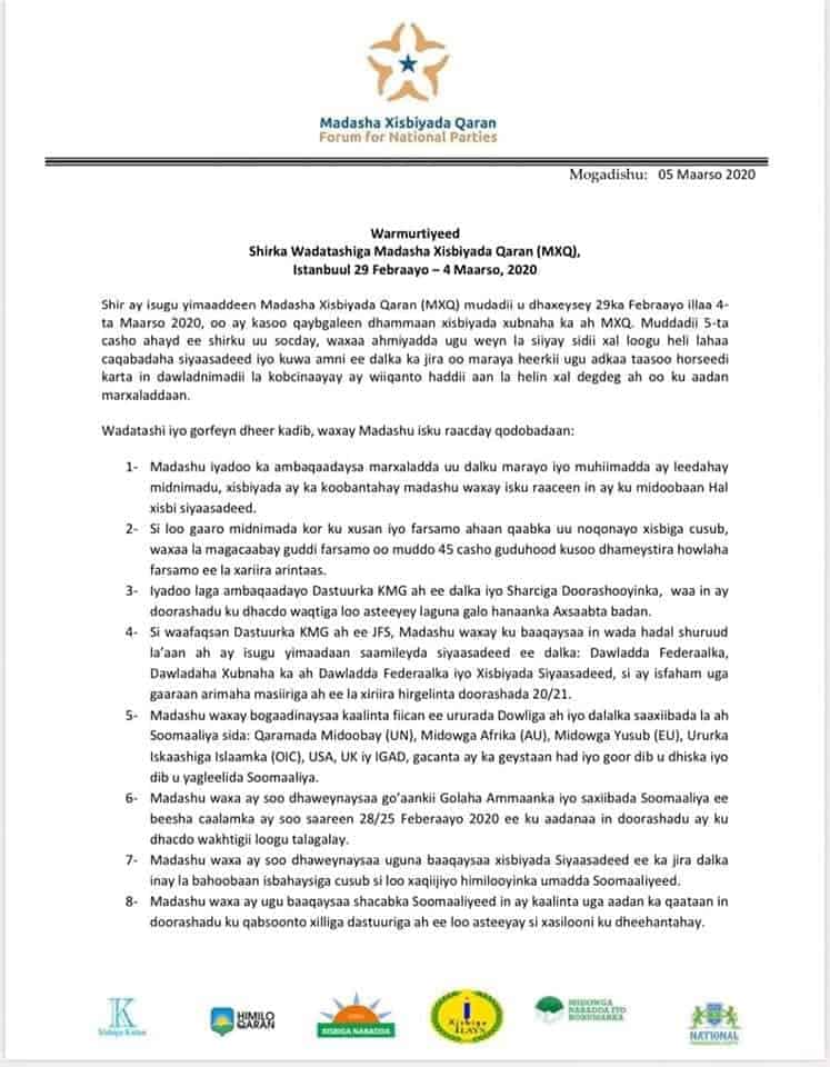 Madasha Xisbiyada Qaran oo ay ku midooobeen Lix Xisbi Siyaadadeed ayaa waxaa ay War-Murtiyeed ay uga hadlayaan Arrimo dhowr ah kasoo saareen Shir Muddo Shan Cisho uga socdey Magaalada Ankara ee dalka Turkiga.