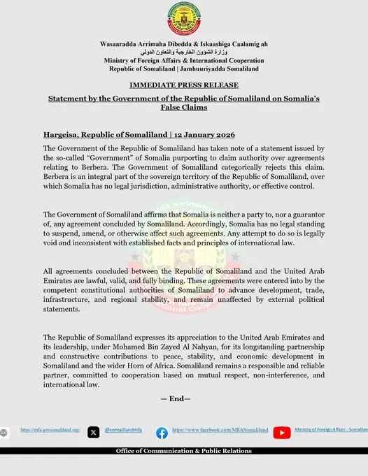 Jamhuuriyadda Somaliland waxay u muujinaysaa mahadnaq Dawladda Imaaraadka Carabta iyo hoggaankeeda, gaar ahaan Sheekh Mohamed Bin Zayed Al Nahyan, iskaashiga soo-jireenka ah iyo kaalinta wax-ku-oolka ah ee ay ka qaateen nabadda, xasilloonida, iyo horumarinta dhaqaalaha Somaliland iyo guud ahaanba Geeska Afrika. Somaliland waxay sii ahaanaysaa saaxiib xilkas ah oo lagu kalsoonaan karo, oo ay ka go’an tahay iskaashi ku dhisan is-ixtiraam, faragelin la’aan, iyo sharcuucda caalamiga ah.