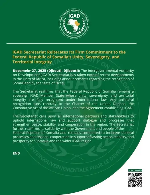 Urur goboleedka IGAD iyo Dowladaha Yaman, Urdun iyo Ciraaq ayaa ka soo horjeestay go’aanka Israel ku aqoonsatay Somaliland iyagoo garab istaag u muujiyay Dowladda Faderaalka Soomaaliya.