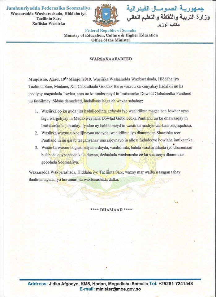 Wasiirka ayaa ku sababeeyey arrintaas in lasoo gaarsiiyey war ku saabsan in Madaxweynaha Puntland uu sheegay in la jabsaday Imtixaankii Dugsiga sare ee Puntland balse wuxuu sheegay inay habooneyd inuu iska hubiyo.