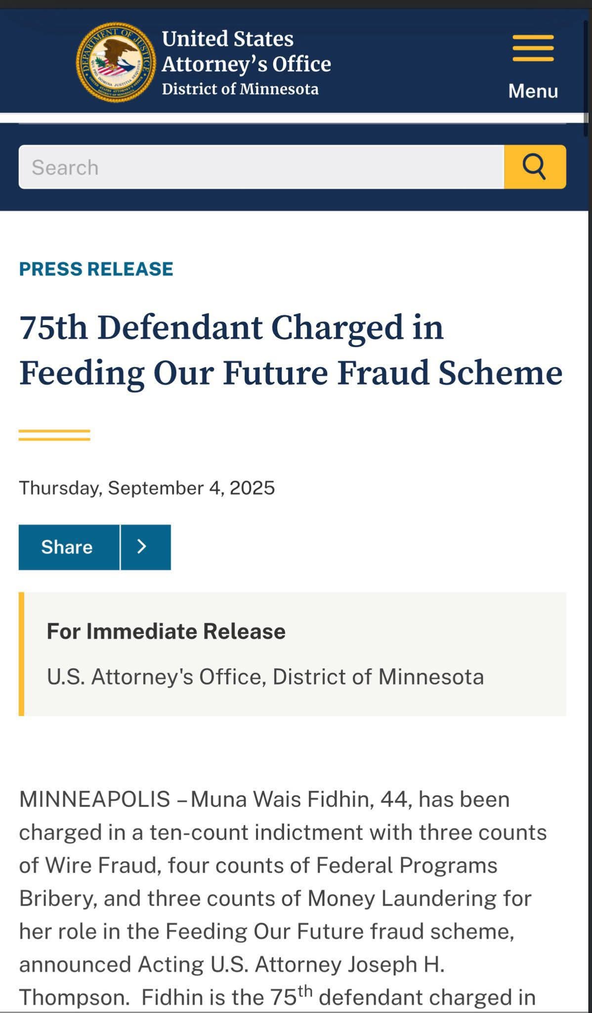 “Iyadoo dacwad lagu soogay eedeysanihii 75-aad ee fadeexadda Feeding Our Future, farriintu intan kama sii caddaan karto,” ayuu yiri Ku-simaha Xeer-ilaaliyaha Guud ee Mareykanka, Joseph H. Thompson. “Haddii aad door ku lahayd musuq-maasuqan, taleefanka qaado oo la hadal FBI-da maanta.”